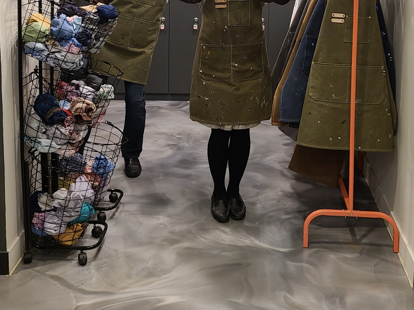 물감이 잔뜩 튀어있는 앞치마를 입고