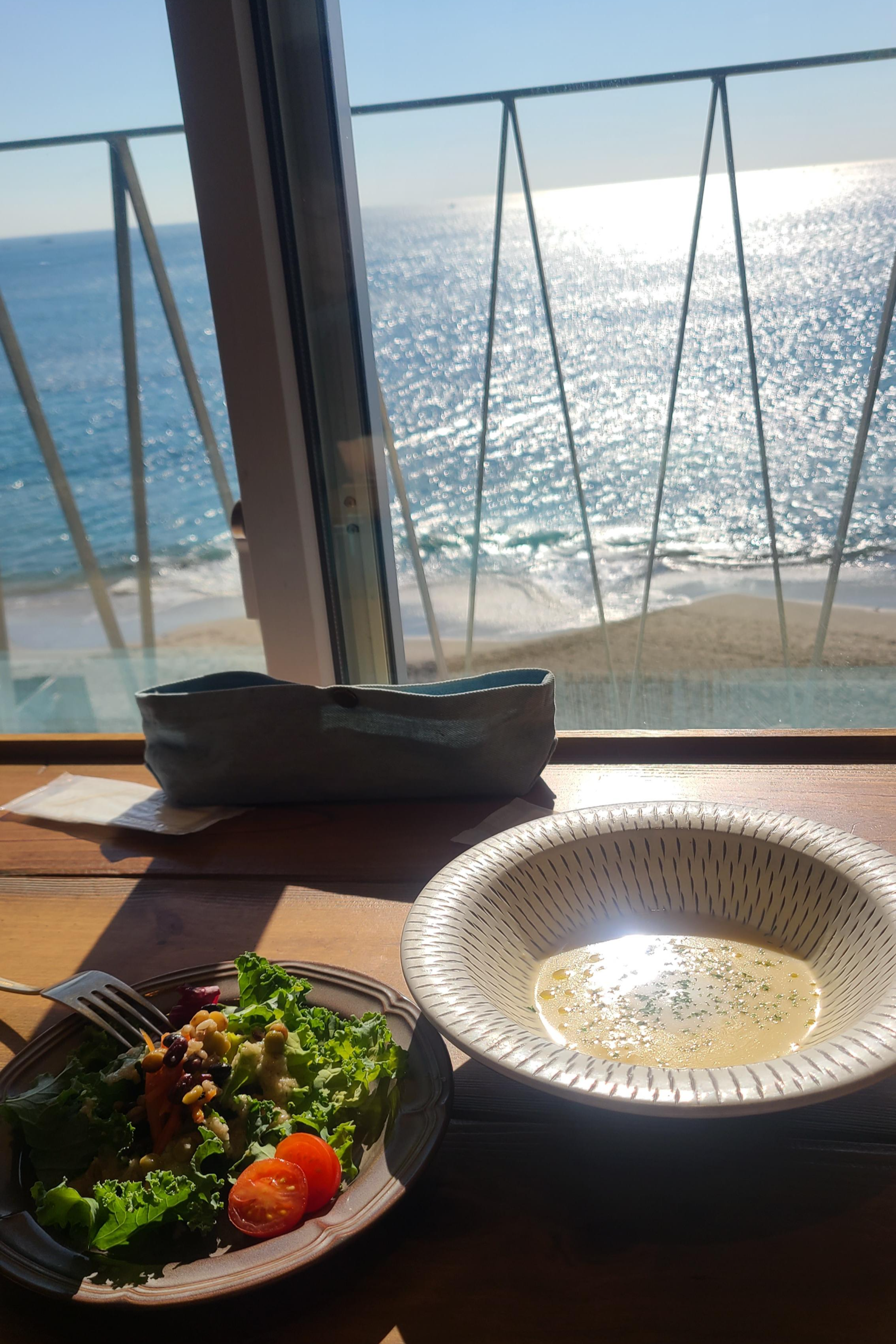 카페거리에는 해변 경치를 감상할 수 있는 많은 카페와 음식점이 있습니다.